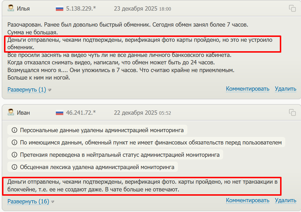 Далее рассмотрим претензии к сервису. В декабре 2025 года пользователи сообщают, что их транзакции заморожены, а деньги возвращать не спешат, несмотря на отправку необходимых видео и верификации карты.
