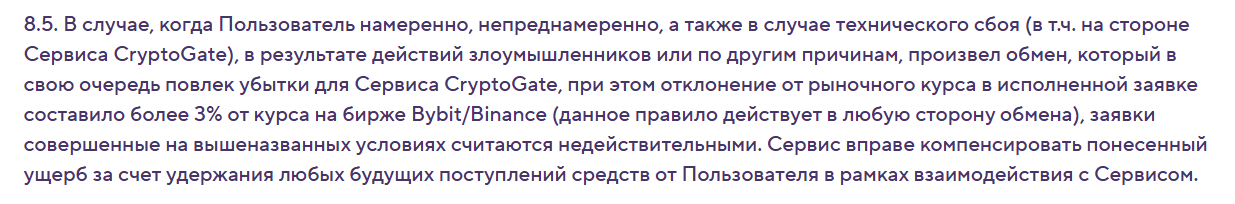 Тарифы сервиса могут меняться без дополнительного уведомления пользователей. Также заметим, что если из-за технического сбоя валютник по исполненной заявке понес убыток (считается отклонение от рыночного курса более 3%), то компания компенсирует свой ущерб, удержав активы из будущих поступлений клиента. Проект ориентируется на курс бирж Bybit и Binance.