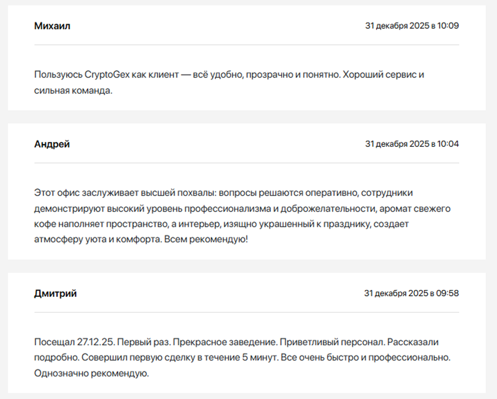 В интернете много отзывов о платформе, и все они хорошие, что выступает преимуществом обменника. Похоже, что сервис популярен, и люди доверяют ему, что нельзя не отметить. Удивительно, что плохих комментариев нет совсем – с одной стороны, это слегка настораживает, но с другой – говорит о безупречной репутации проекта. Пользователи пишут в рецензиях, что сотрудники настоящие профи, которые работают быстро и всегда идут навстречу. О мошенничестве и разводе в CryptoGex Shop отзывов нет, и это плюс.
