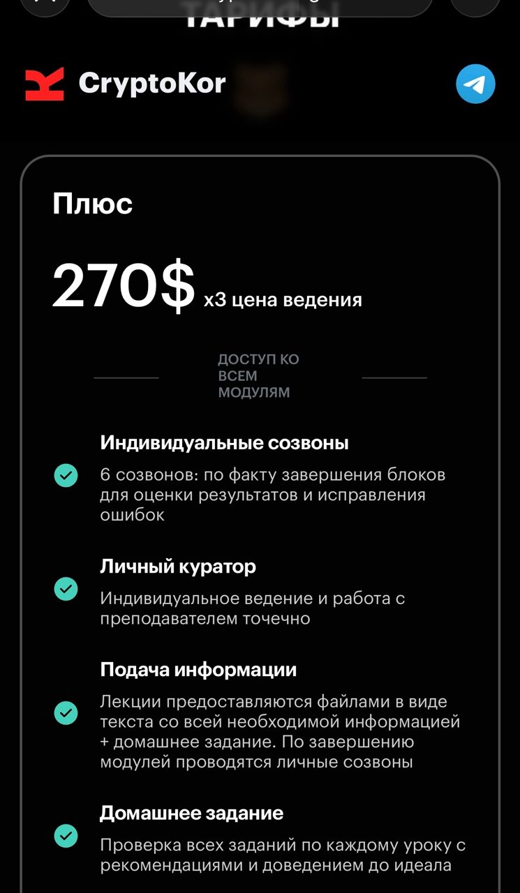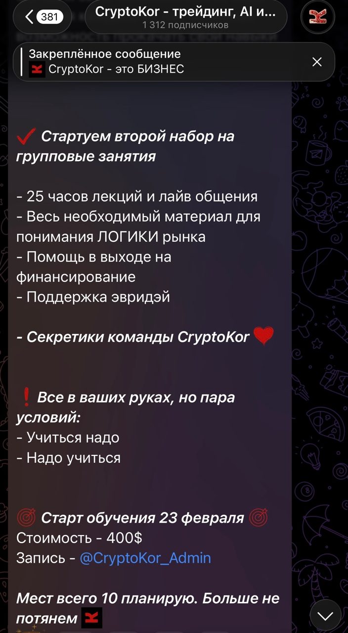 Не так давно на канале «CryptoKor — трейдинг, AI и инвестиции» стала появляться информация о наборе на новый курс по трейдингу. Авторы утверждают, что количество мест строго ограничено, цена курса составляет 400 долларов. Ученикам обещаны 25 часов лайв-общения с командой Cryptokor, материалы для понимания логики рынка, помощь в выходе на финансирование, ежедневная поддержка.