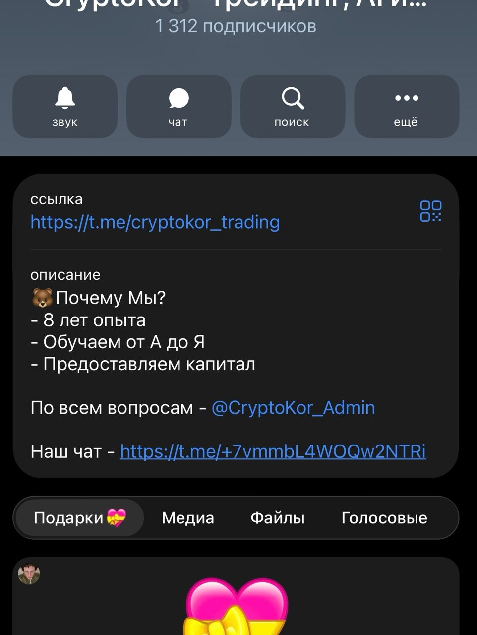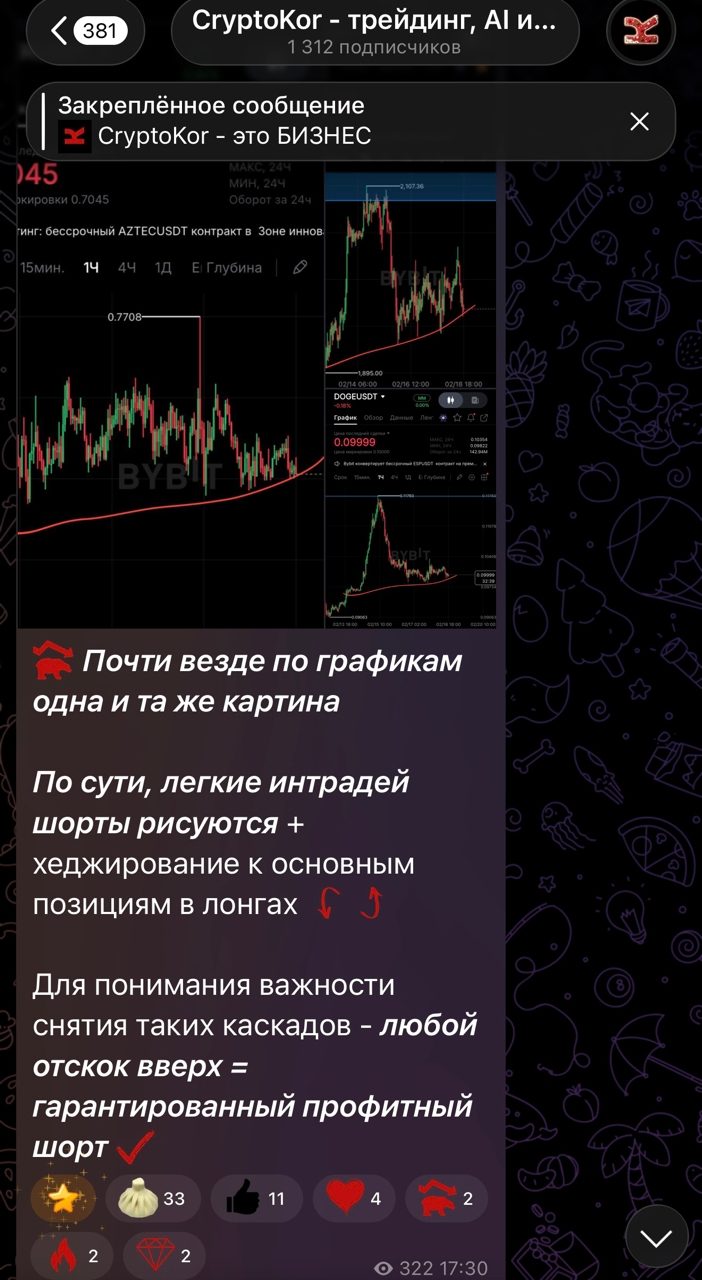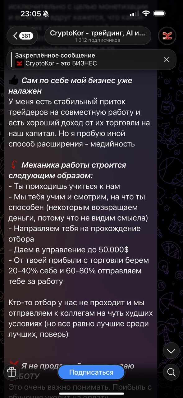 В одном из закрепленных постов на «CryptoKor — трейдинг, AI и инвестиции» есть информация, что перед нами не просто информационный канал о торговле криптой, а полноценный бизнес-проект.