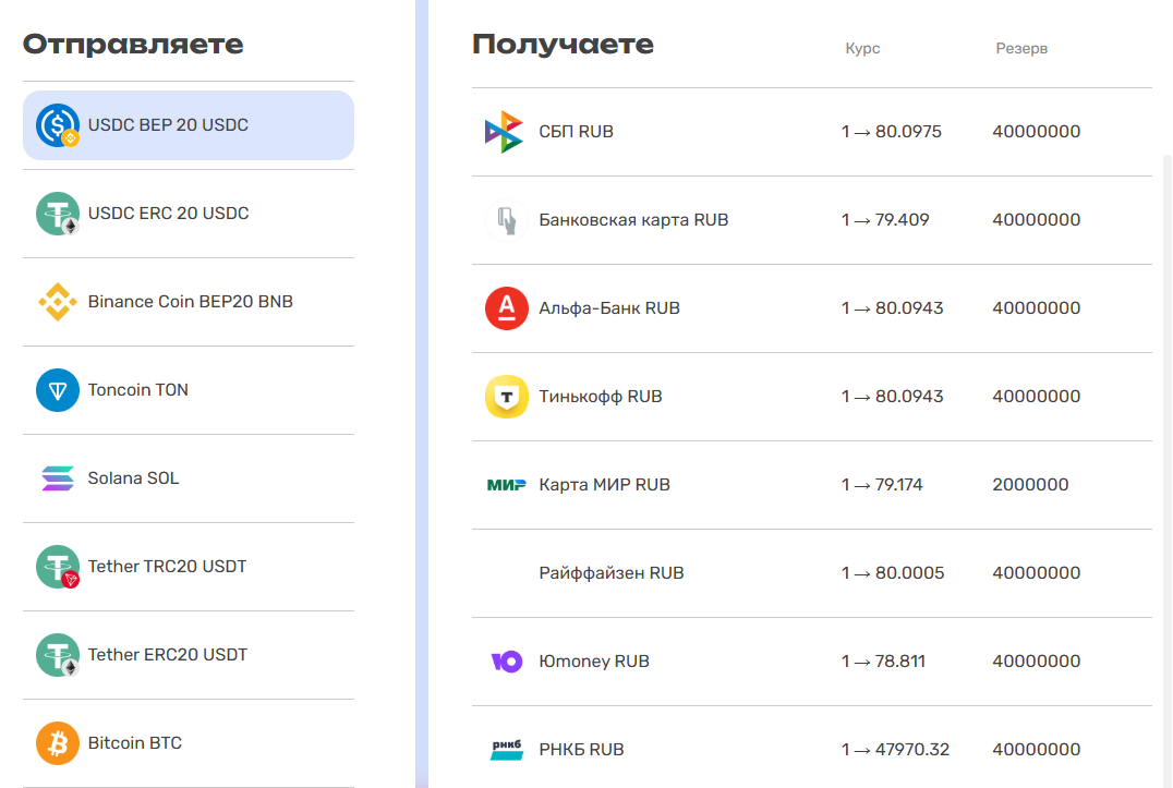 Обменник Cryptonetpro работает с популярными криптовалютами – BTC, ETH, USDT в разных сетях, BNB, SOL, TON, LTC и другими. На вывод доступны карты основных российских банков, СБП и платежные системы. Среднее время обработки заявки – от двадцати минут до трех часов. В правилах обмена прямо указано, что выплаты в рублях могут приходить частями – до пяти отдельных переводов.