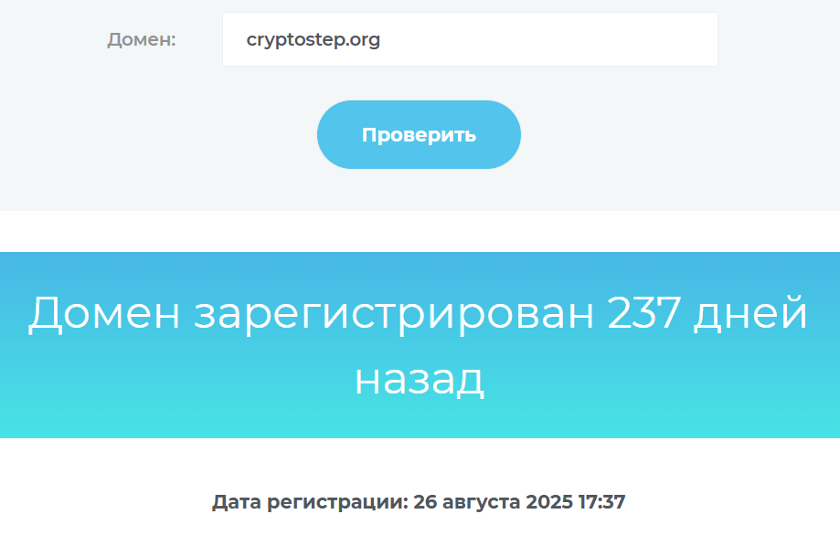 Еще один явный признак скам-платформы — недостоверные сведения о дате запуска проекта. На официальном сайте Cryptostep указано, что биржа работает на протяжении 7 лет. Но ее ресурс был зарегистрирован лишь 26 августа 2025 года и до этого времени его не упоминают вовсе.