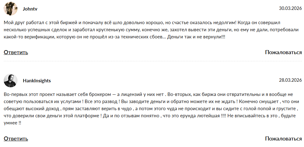 Все свидетельствует о том, что никаким «надежным гарантом» эта биржа не является. Это очередная нелегальная платформа, представители которой в пару кликов могут украсть ваши сбережения.