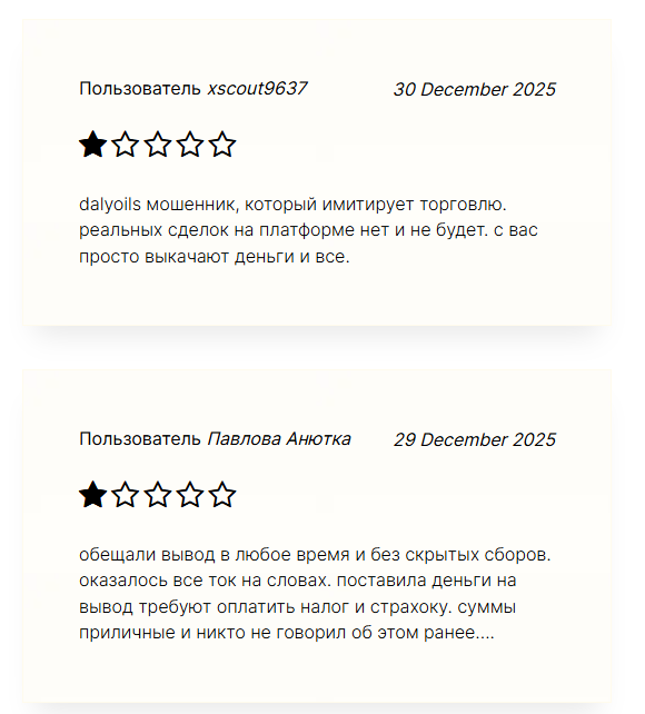Отзывы о Dalyoils в основном отрицательные. Люди пишут, что вывести деньги сложно: заявки висят «в обработке», сроки переносят, ответы расплывчатые. Частая жалоба – навязывают дополнительные пополнения. Просят внести еще «для подтверждения», «для комиссии» или «для ускоренного вывода». Если отказываешься, процесс стопорится. Условия называют непрозрачными. То, что обещают на сайте, не совпадает с тем, что видит пользователь в кабинете: другие комиссии, ограничения и дополнительные шаги, о которых заранее не говорят. Поддержка отвечает редко и шаблонно. В итоге у людей ощущение, что рекламные обещания и реальная работа платформы – это две разные истории.