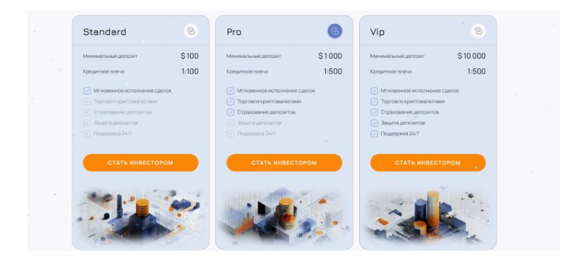 Компания обещает доступ к разным рынкам. На сайте перечислены форекс‑пары, сырье, криптовалюты, акции, биржевые индексы, драгоценные металлы и другие популярные активы. Формат стандартный: выбираете инструмент и открываете сделки через платформу. Торговля ведется по нескольким тарифам. Они отличаются минимальным депозитом, размером кредитного плеча и набором дополнительных сервисов. Конкретные различия описаны кратко, без подробностей. И вот что бросается в глаза. Брокер не раскрывает базовые параметры: комиссии, спреды, свопы, требования по марже и прочие условия. Без этой информации сложно заранее посчитать издержки и понять реальную стоимость торговли.