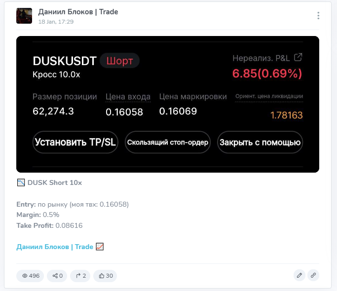 Важно учитывать, что с высокой вероятностью Даниил не является трейдером, у него нет прозрачной статистики, а ссылкой / скринами с биржи он не делится. В последнее время появилось много псевдо трейдеров, которые просто воруют сигналы из других каналов / форумов и платформы TradingView и выставляют их за свои. Убедиться в навыках, опыте попросту невозможно. Также в ленте пустует и новостной / политический блок, хотя они нередко влияют на цену.