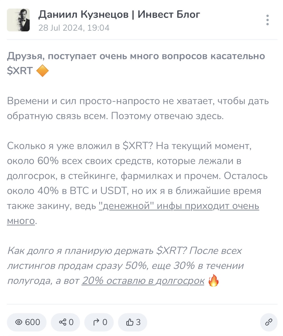 Наибольший интерес вызывают публикации, в которых долго и методично прогревают аудиторию, предлагая ей купить определенный актив. То это новости о том, что найдена уникальная монета с потенциалом «ту зэ мун», то о резком ее взлете, то о том, сколько Кузнецов сам в нее вложил. Причем последний пункт автор ничем не доказывает.