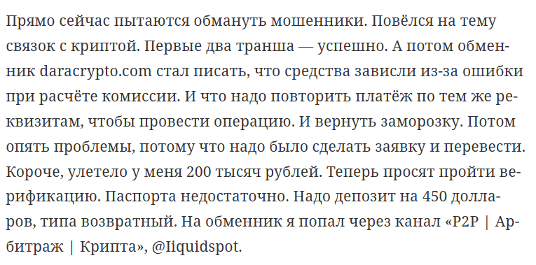 Пользователи пишут, что узнали о сайте через какой-то канал в Телеграм, где им предложили заработать на арбитраже, причем в отзывах о DaraCrypto com утверждают, будто первые платежи прошли успешно, но стоило внести более крупную сумму, администраторы прислали сообщение о блокировке.