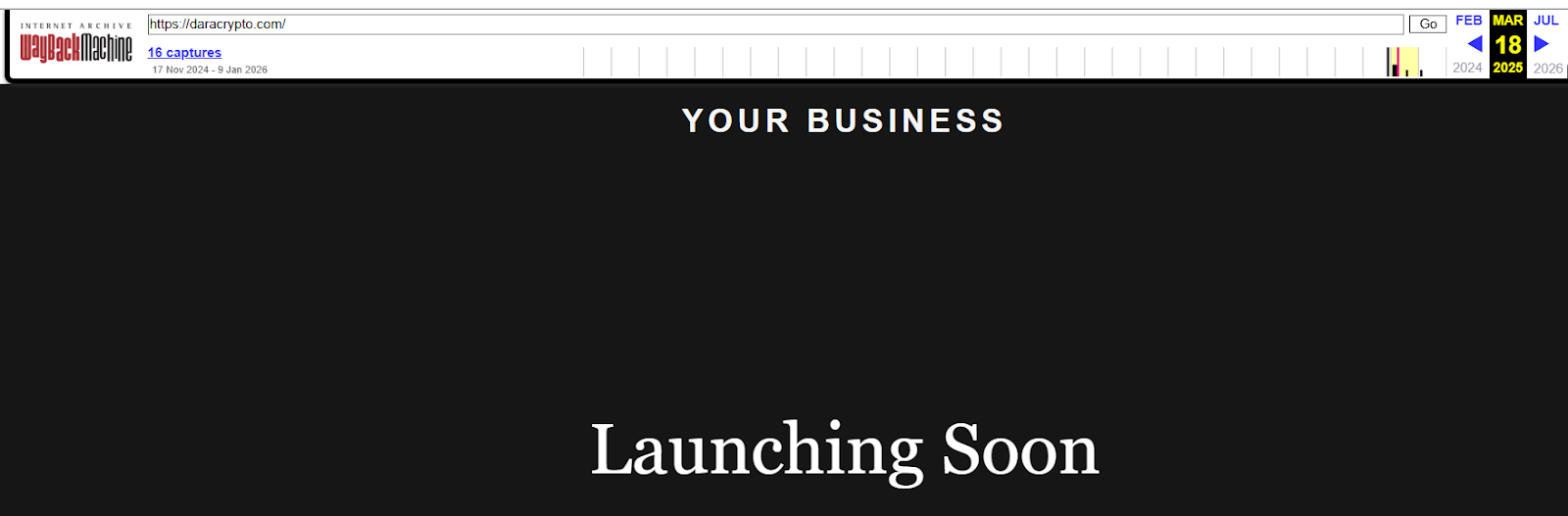 Дополнительным подтверждением малого срока работы служат снимки в веб-архива, где за 2026 год вообще отсутствуют записи, а за предыдущие периоды в сохранениях только анонс запуска какого-то бизнеса.