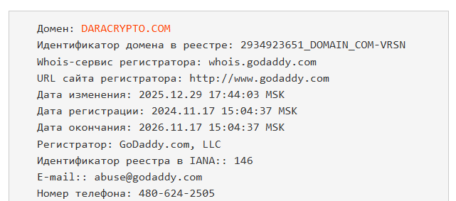 Подробности о комиссиях неизвестны, но пользователи пишут, что курс обмена был выгодный, поэтому площадка подходила для арбитража. Проверка домена через Whois ru показала, что дата регистрации и последних изменений DaraCrypto com отличается, поэтому можно предположить началу работы сервиса только 29.12.2025.