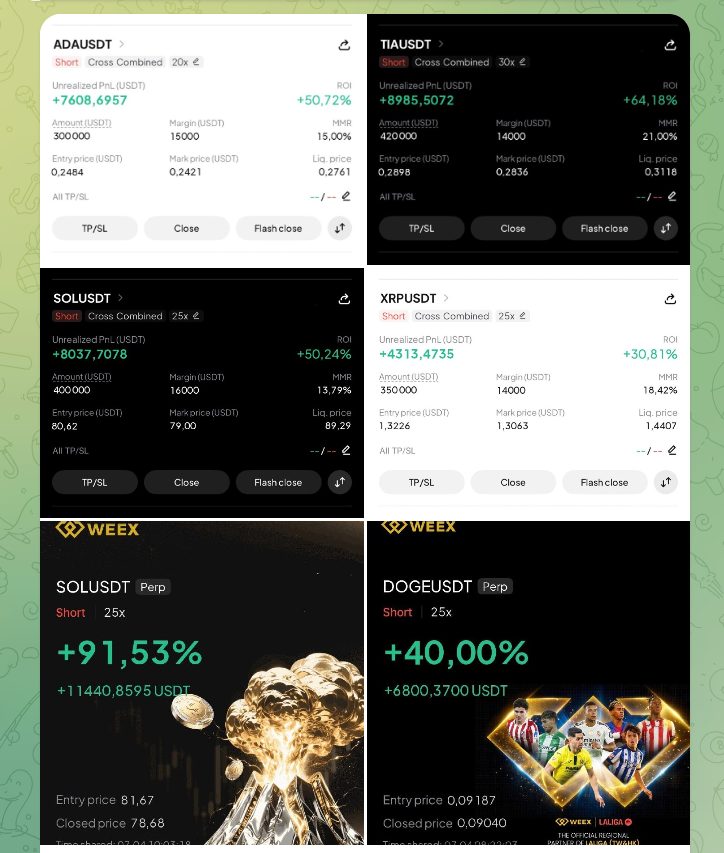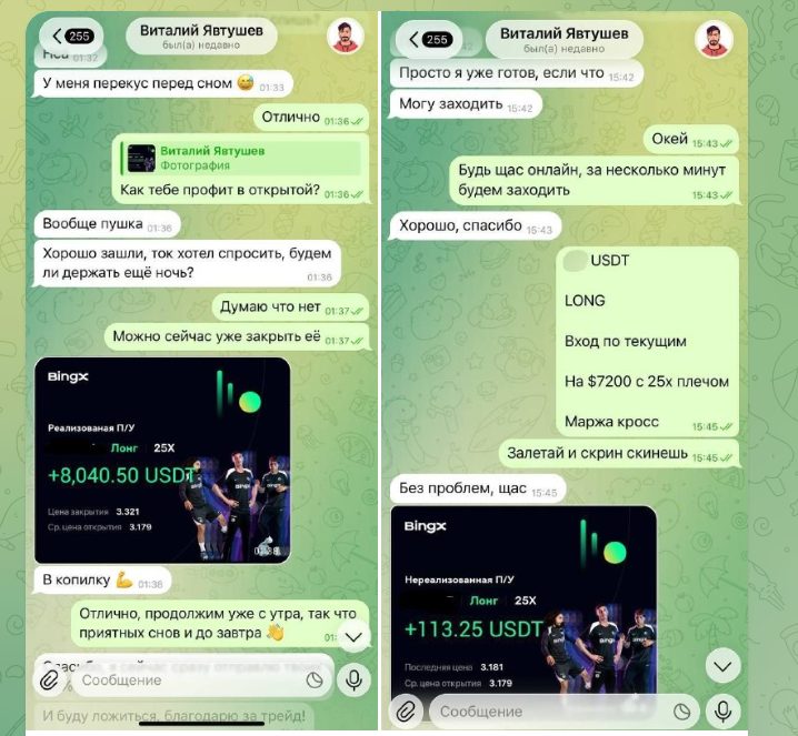 В описании иногда приводится более детальная информация с анализом рынка. Для подтверждения успешной торговли Daria Orlova периодически добавляет скрины с биржи BingX. В них указывается текущая доходность, кредитное плечо и другие данные. Во всех случаях администратор показывает только “плюсовые” сделки.