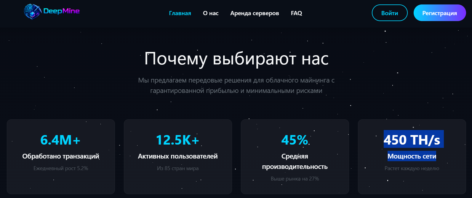 На сайте не представлено полноценного описания тарифов, условий инвестирования или расчета доходности с учетом рыночных факторов. При этом упор делается именно на стабильный заработок, что само по себе нетипично для майнинга. В реальности доходность в этой сфере напрямую зависит от:
