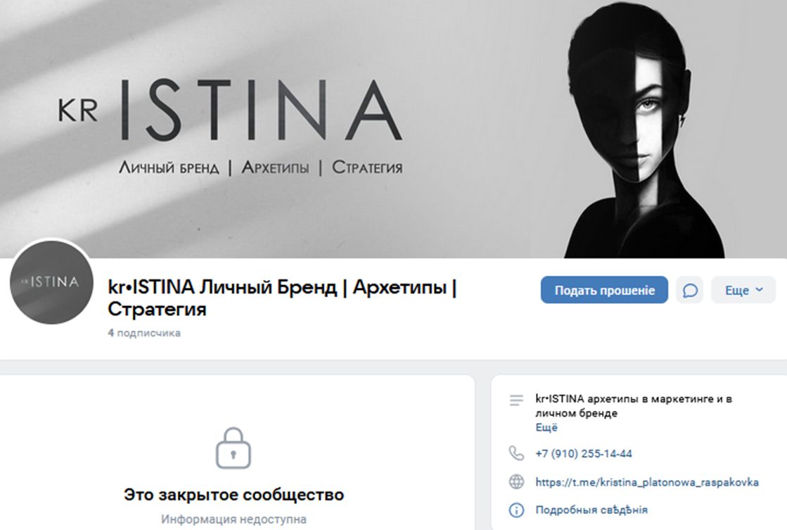 Кристина ведет социальные сети, имеет две официальные группы – в ВК и Телеграмм. Аккаунт ВКонтакте приватный, включает всего 4 подписчика. Складывается впечатление, что группа создана только для общения с клиентами. По всем вопросам коуч предлагает писать в Телеграм Kristina Platonova Raspakovka или звонить по тел. +79102551444.