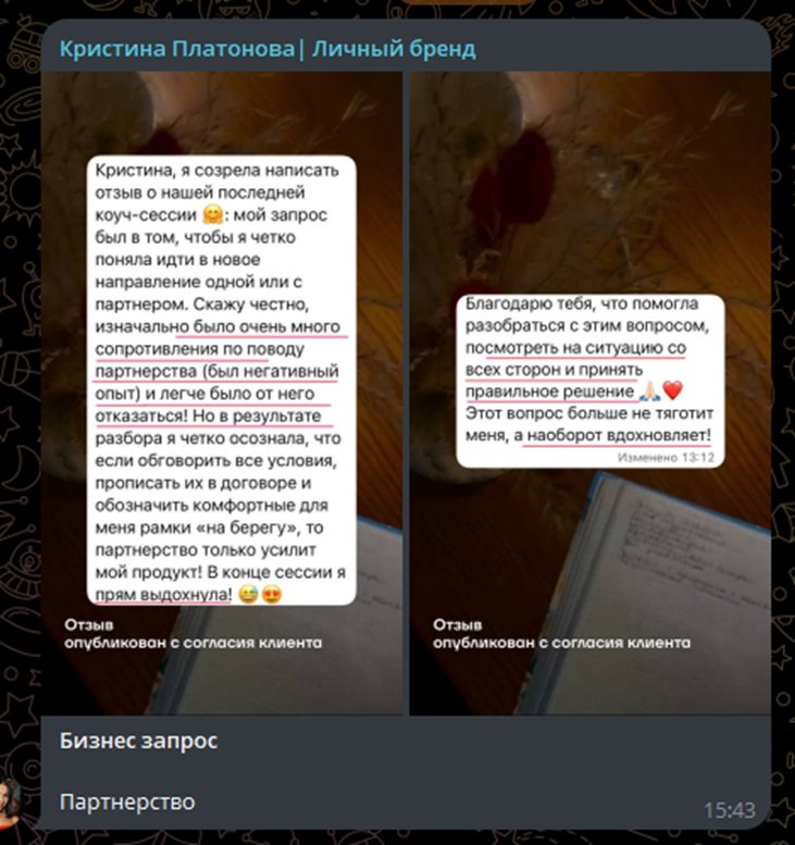 В Телеграмм Кристина ведет отдельную группу для отзывов и отчетов о своей деятельности. Платонова выставляет скрины переписки и благодарностей клиентов, но по большей части без указания имени или аккаунта. Скрины имеют пометку о том, что они публикуются с согласия подписчика. С учетом особенностей деятельности консультанта, такая ситуация с отзывами оправдана.