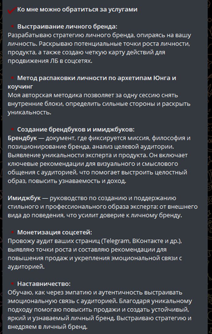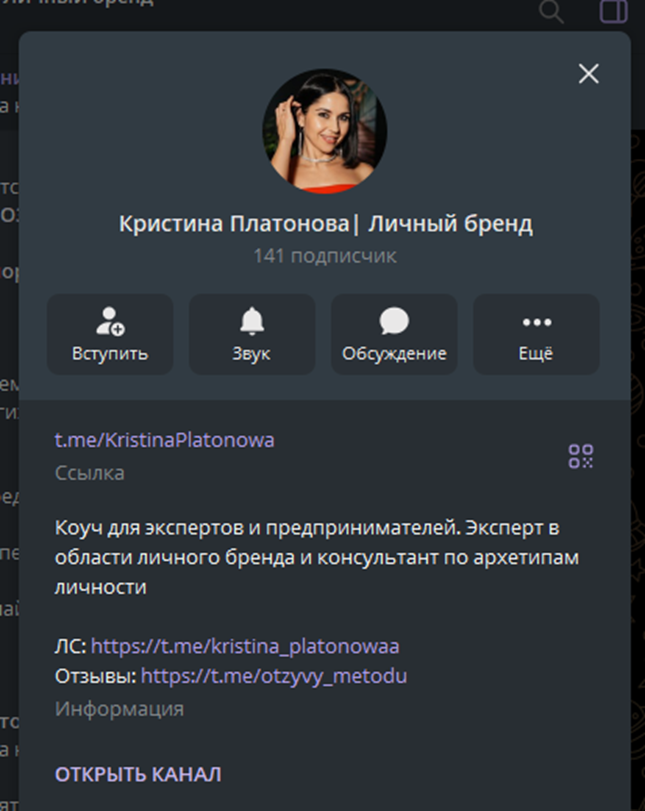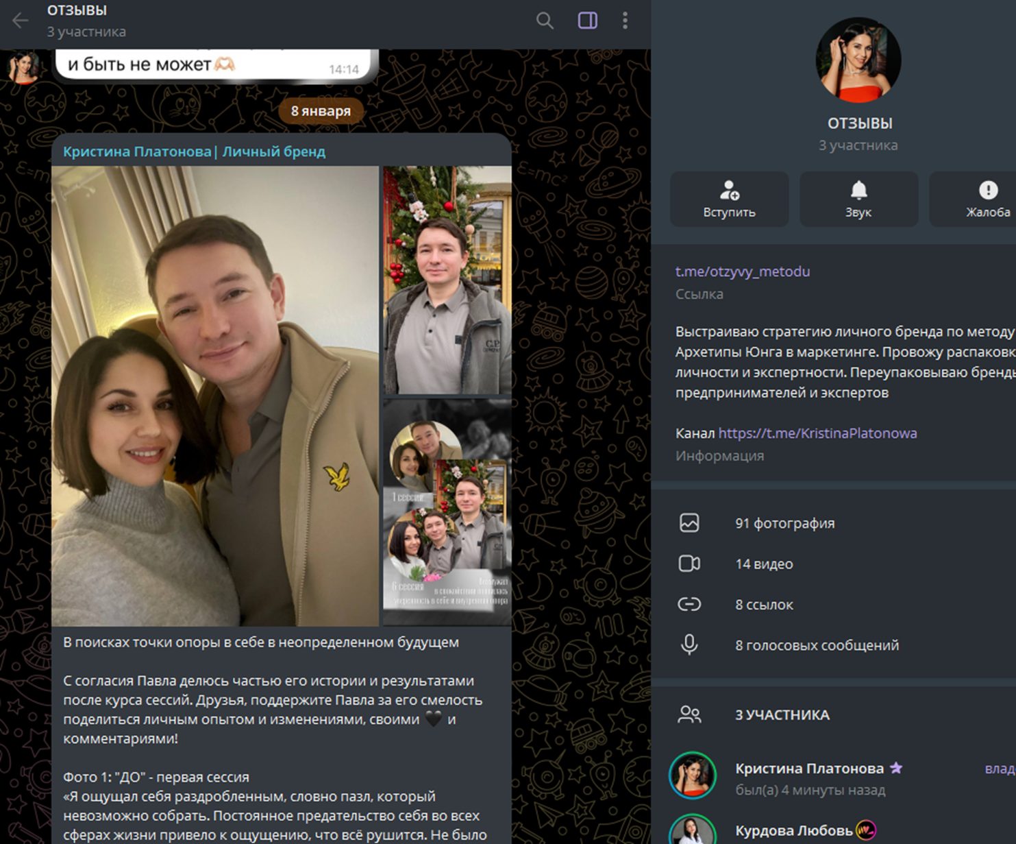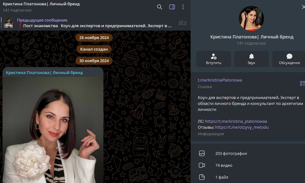 Канал в Телеграмм KristinaPlatonowa насчитывает всего 141 подписчика. Консультант предлагает услуги в области построения собственного бренда, анализа архетипа. Клиентам доступны личные встречи с коучем, персональный выбор стиля или построение стратегии онлайн. Также среди услуг – продажа специализированных программ, которые направлены на повышение самооценки, усиление идентичности.