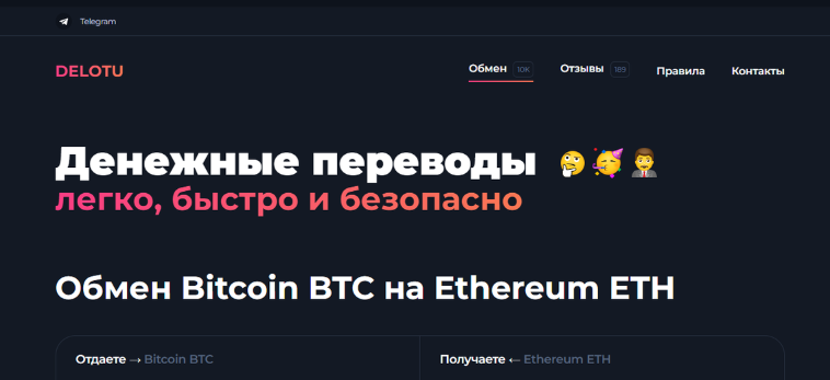 Delotu com – криптовалютный обменник, созданный в 2025 году. Проект позволяет пользователям менять популярную крипу, в том числе такие токены как Btc или Eth. Среди преимуществ платформы создатели указывают легкость и безопасность переводов. В сети у площадки крайне негативные отзывы, клиенты говорят, что это фейковый обменник, созданный для скама и кражи денег. Сайт выглядит как шаблонная копия других платформ, известных как мошеннические. В этом обзоре мы рассмотрим сайт и отзывы клиентов об обменнике «Делоту» и проанализируем, стоит ли пользоваться его услугами.