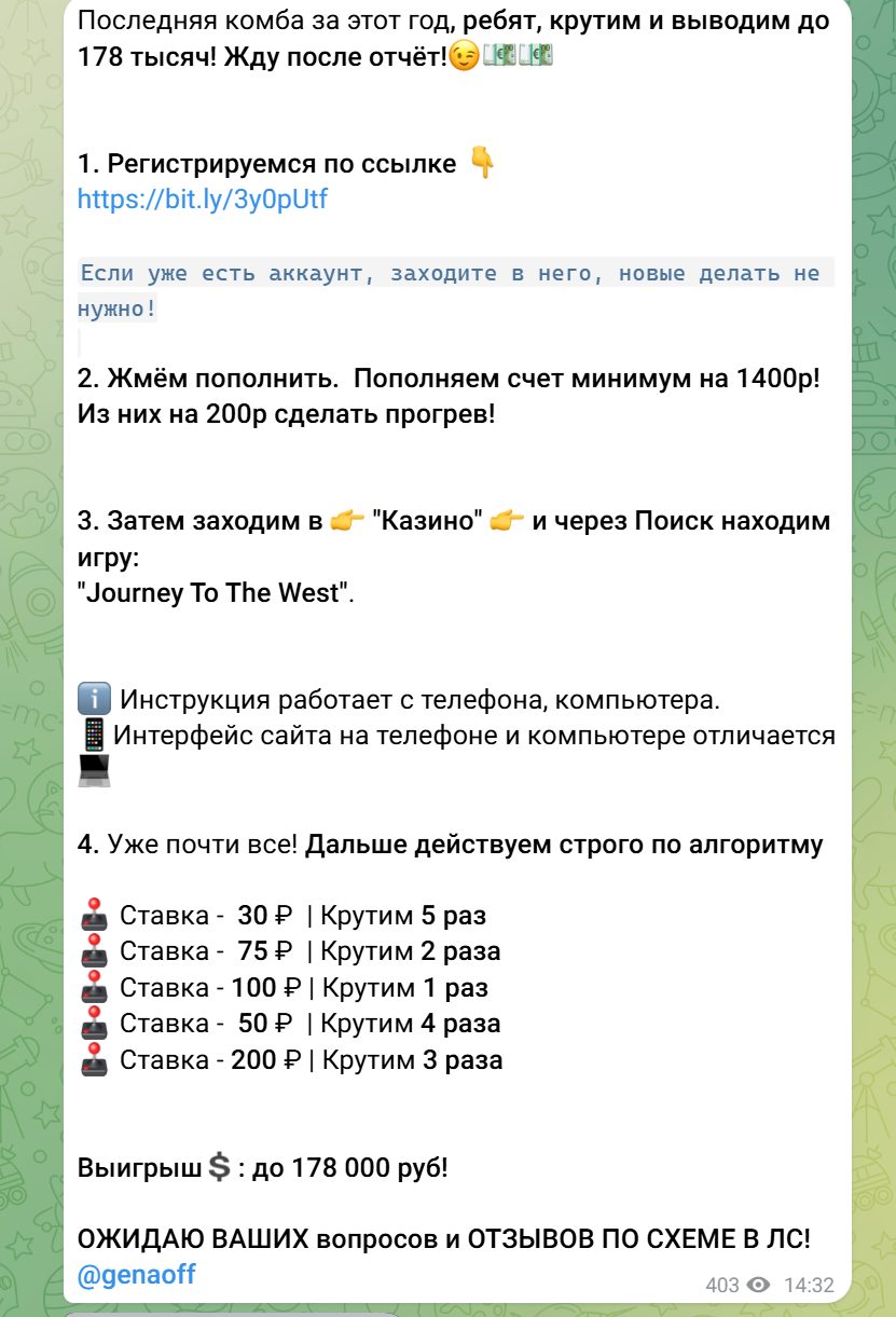6 марта 2019-го произошло резкое изменение тематики канала в Телеграмме. Автор заявил о возможности получения крупного заработка в размере от 700 до 900 тыс. рублей. Он начал приводить схемы, которые можно использовать в реальном казино. Такие алгоритмы предусматривали следующие шаги игроков: