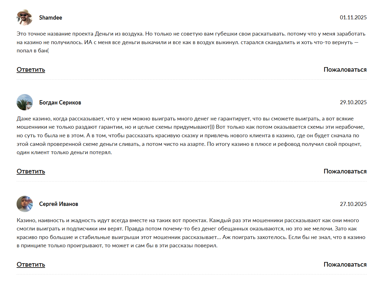 Уже в период активности сообщества Деньги из воздуха было подозрение на качество платформы. Грамотные люди понимали, что системы выигрыша у казино не существует. Единственным успешным человеком в этой схеме был сам автор, который регулярно получал реферальные отчисления от онлайн-казино.