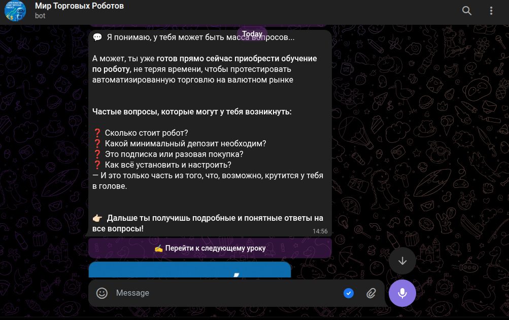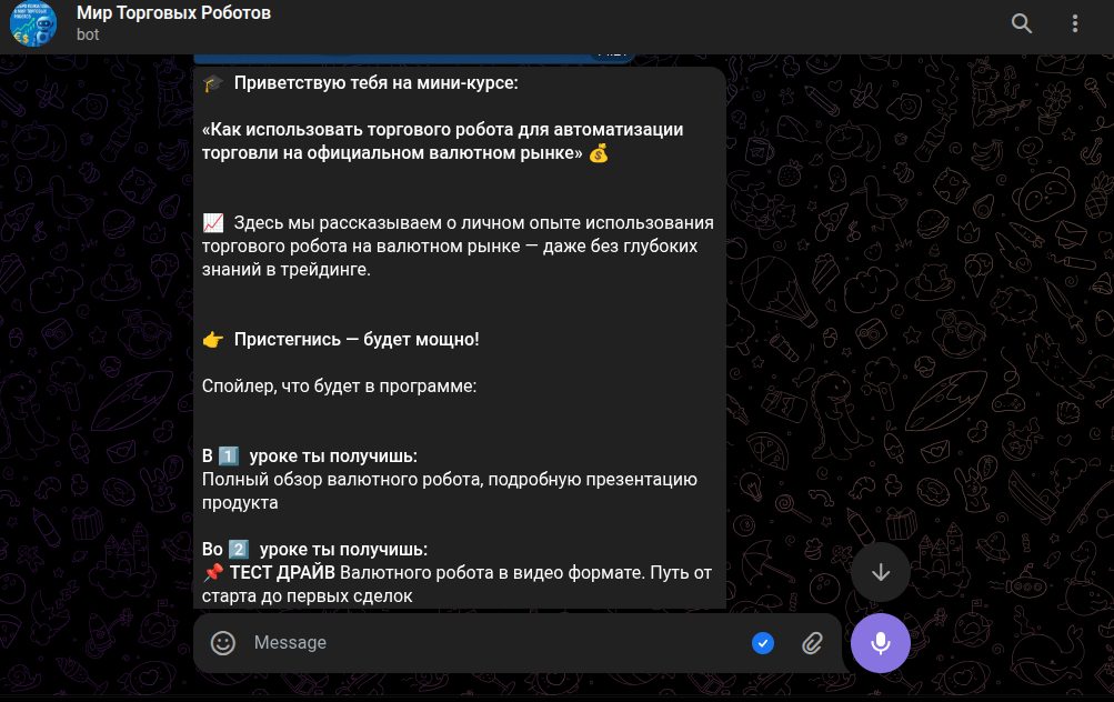 Для старта работы с валютным роботом Дениса Бухинцева нужно использовать бот https:// t me/trade_rob0t_bot. Через него эксперт публикует свежие образовательные материалы, а после предлагает доступ к программному обеспечению. Итак, чтобы запустить бот, надо прописать команду /start. Далее проект показывает структуру уроков и что в них будет.