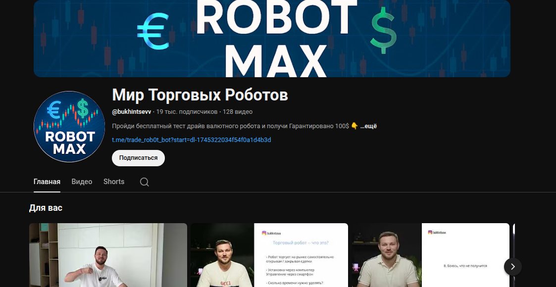 У автора валютного робота Дениса Бухинцева есть тик-ток, рутуб и ютуб. На YouTube у проекта эксперта свыше 19 000 подписчиков. Старт канала был 11 февраля 2020 году. За все время проект набрал суммарно более 13 миллионов просмотров. Контент обучающий — Денис рассказывает о преимуществах его программного обеспечения.