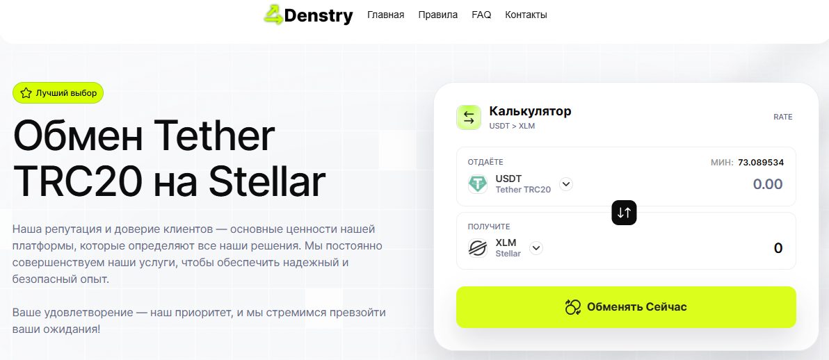 Denstry обменник криптовалют, якобы дающий пользователям полную безопасность, отзывчивую поддержку и возможность проводить операции с крупными суммами. Рассмотрим, как он работает, насколько честен с клиентами и стоит ли с ним связываться.