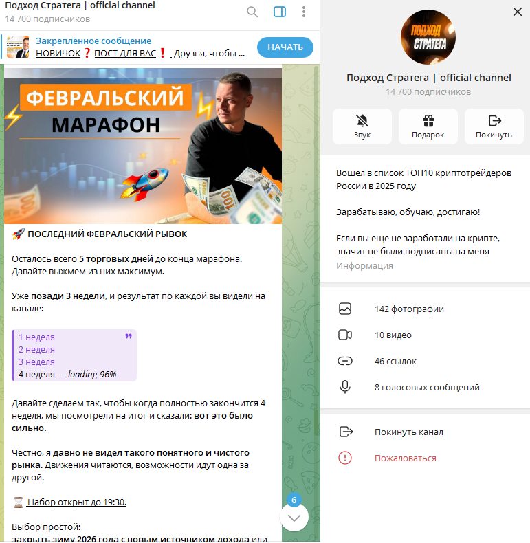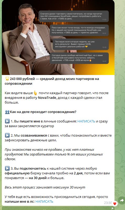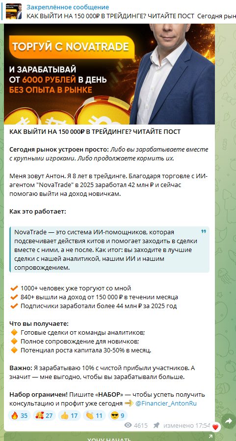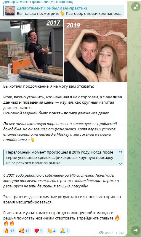 Автор рассказывает о том, что в трейдинге он более 8 лет, сам зарабатывает миллионы и клиентам помогает. Но никаких подтверждений этому нет, статистика отсутствует, а контент в сообществе не выглядит профессионально.