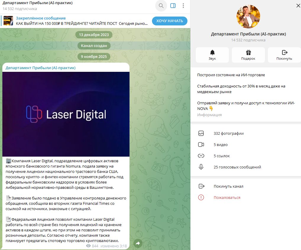 Департамент Прибыли AI практик – Телеграмм-канал, созданный трейдером, представляющимся подписчикам как Антон. Автор заявляет, что в трейдинге он более 8 лет, а с помощью ИИ-ботов смог выйти на высокий доход, а теперь он помогает пользователям зарабатывать от 150 тысяч рублей в месяц. Проект не успел получить оценок пользователей, мы провели его проверку.