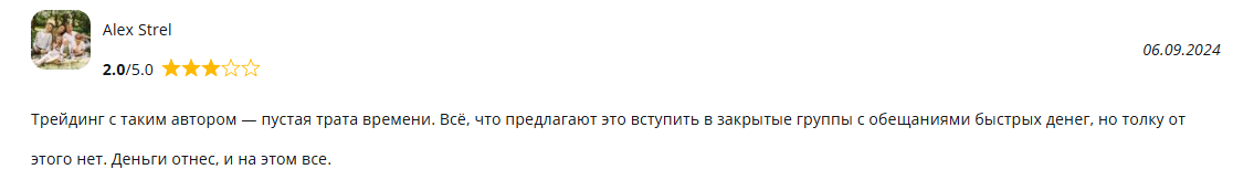 Юзер с никнеймом Alex Strel признался, что трейдинг с таким специалистом – это пустая трата времени и денег.
