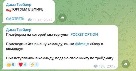 В одном из постов на канале Дмитрий рекламировал услуги биржи Pocket Option, репутация которой на рынке сомнительная. Возможно, он участвует в партнерской программе и зарабатывает на рефералах.
