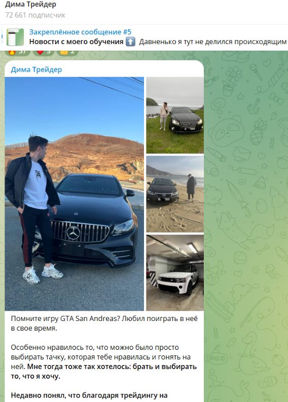 Трейдер часто публикует фото на фоне дорогих автомобилей, предметов роскоши, которые, вероятно, должны создать нужное впечатление у аудитории.
