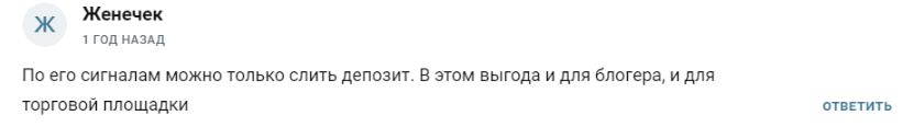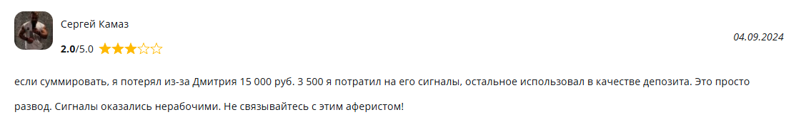 В Интернете отсутствуют довольные клиенты и положительные оценки о Дмитрии, зато удалось найти негативные. Пользователь с ником Женечек в своем отзыве пишет, что на сигналах из «Дима трейдер» он потерял депозит и не смог его вернуть.