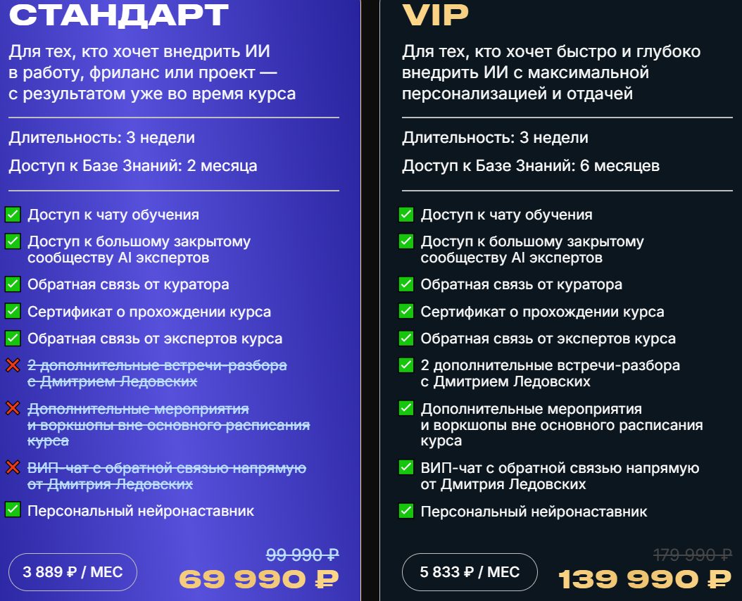 Базовый тариф стандарт курса Нейробизнес на миллион Дмитрия Ледовских стоит 70 000 рублей в месяц. В ходе него ученика обещают научить делегировать часть своей работы нейросетям, а курс якобы подойдет фрилансерам, наемным специалистам, предпринимателям и руководителям. Есть более дорогая версия за 140 000 рублей, в которой обещают доступ в ВИП-чат и возможность общения с Ледовских.