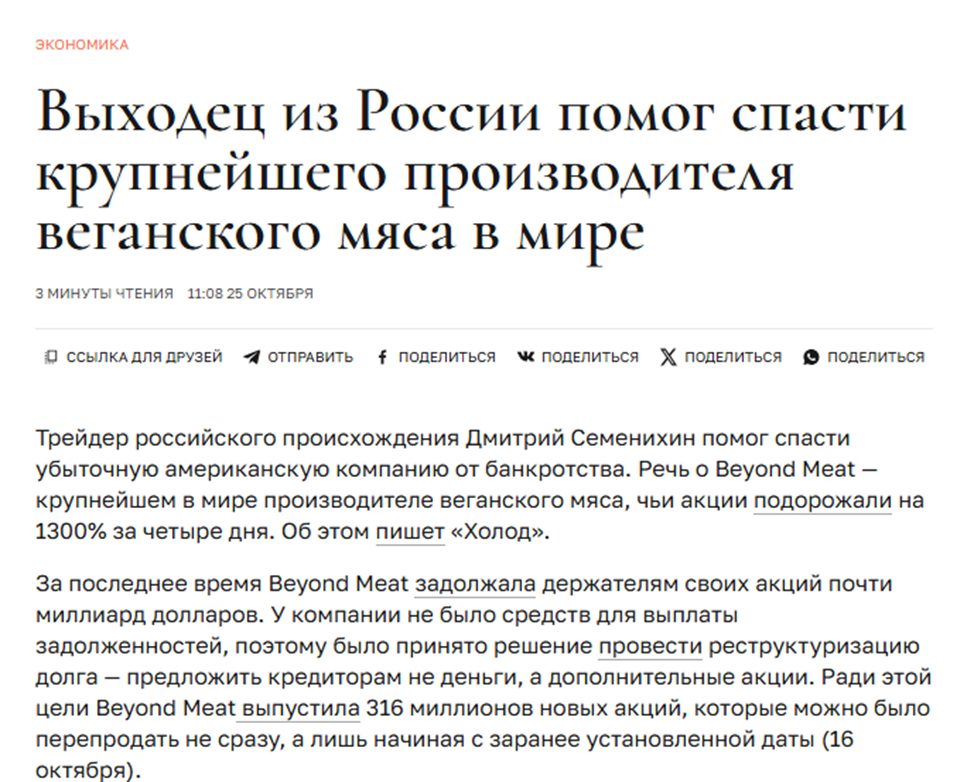 Дмитрий Семенихин — одиозная личность, которой не стоит слепо верить. Нет никаких доказательств, что ситуация вокруг Beyond The Meat создана искусственно, равно как фактов, что инвестор способен безошибочно читать рынок и бесплатно делиться сверхприбыльными инсайдами.