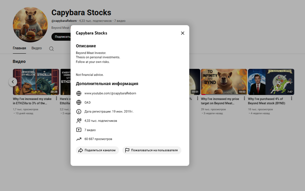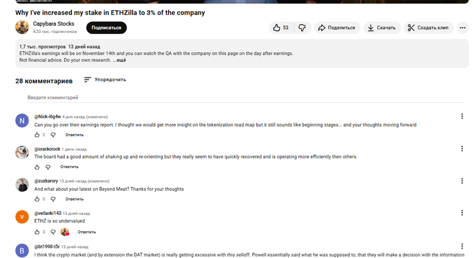 Первые три видео посвящены пампингу акций Beyond The Meat, остальные — рекламе криптовалютного стартапа ETHZilla. Под роликами @ CapybaraReborn встречаются противоречивые отзывы. Часть аудитории благодарит Дмитрия за дельные советы, оппоненты обвиняют трейдера в финансовых махинациях и продвижении откровенного скама.