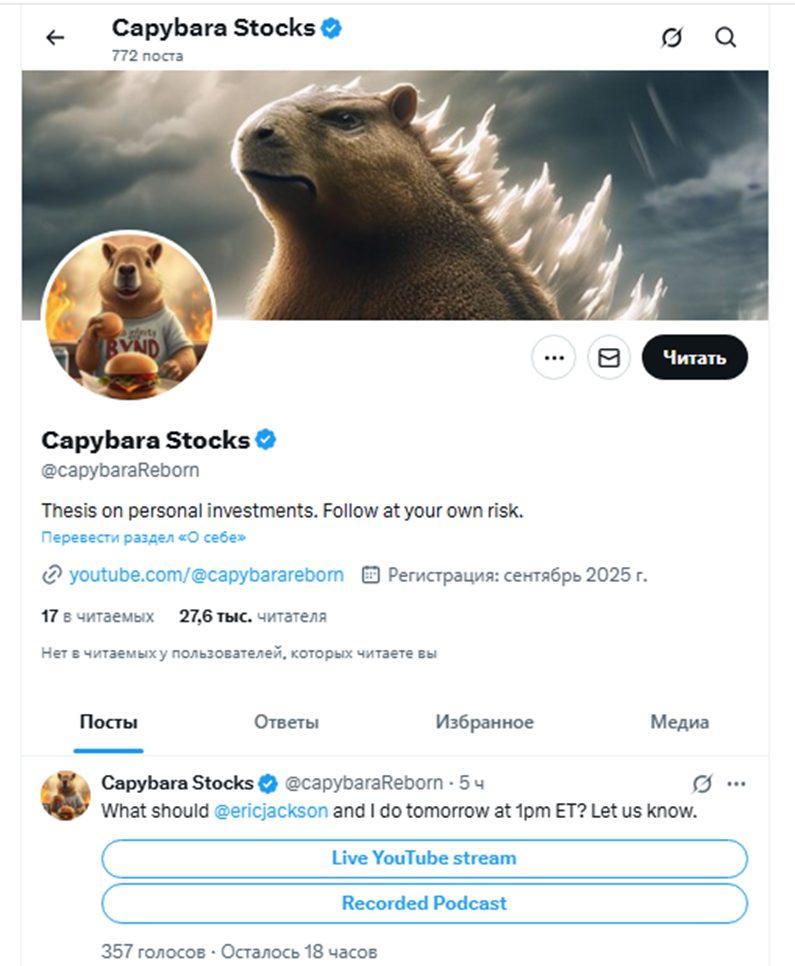 Трейдер «Капибара стокс» заметен в социальных сетях с сентября 2025 года. Основную информационную деятельность он ведет в X. Аккаунт @ CapybaraReborn на 18 ноября 2025 года имел более 27 тыс. подписчиков. За 2 месяца с момента создания в ленте появилось 772 поста. Подобная активность не характерна для начинающих блогеров, а больше свойственна целой команде опытных PR-щиков.