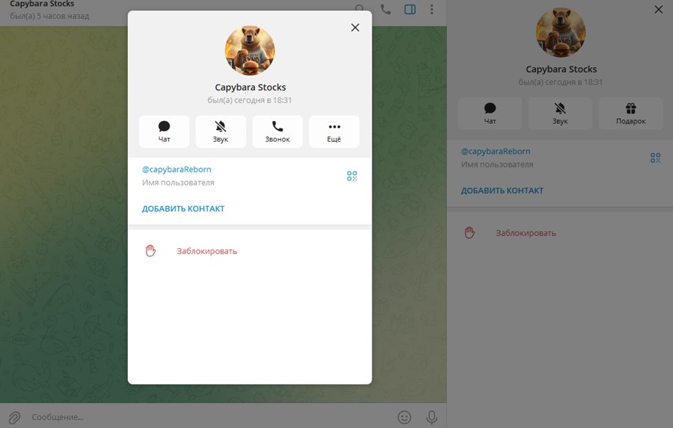 В Телеграмме инвестор представлен личным аккаунтом @ Capybara Stocks. Владелец профиля регулярно бывает онлайн, но не имеет связанного информационного канала.