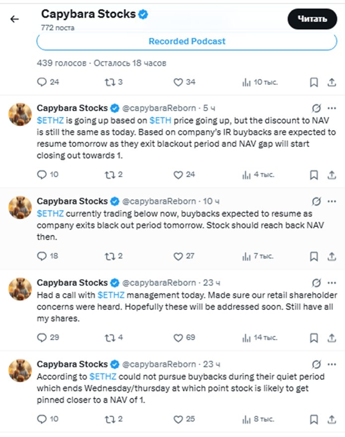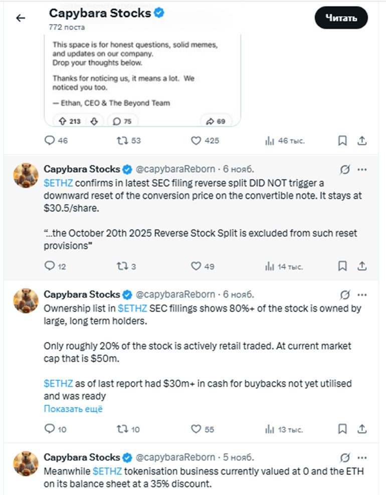 В ноябре 2025 года все внимание Capybara акцентировано на хайпе ETHZilla. Дмитрий видит в проекте большой потенциал и призывает подписчиков не пропустить лучший момент для инвестирования.