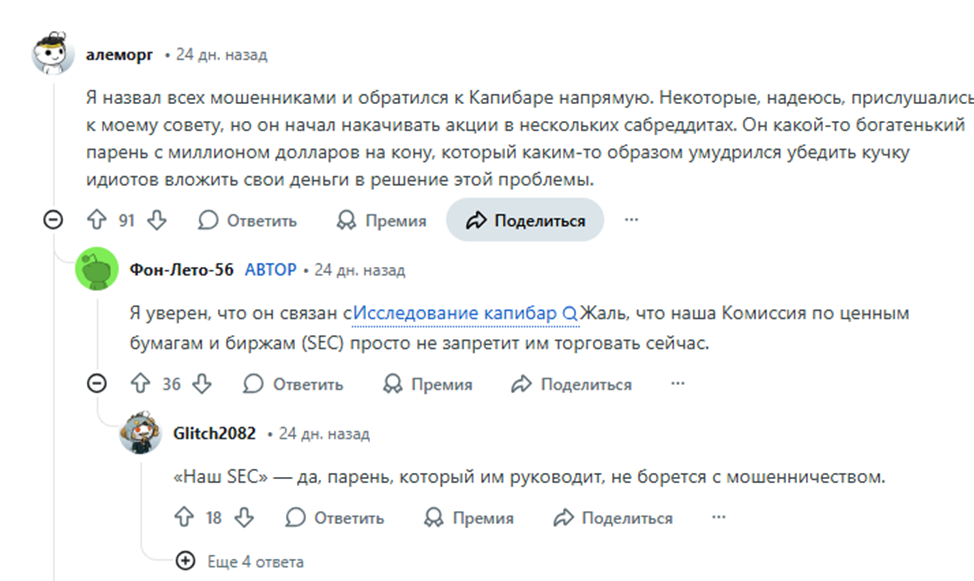 Деятельность CapybaraReborn провоцирует как положительные, так и отрицательные отзывы. Некоторые трейдеры пишут, что благодаря посту Дмитрия на Reddit им удалось неплохо заработать на акциях Beyond The Meat.