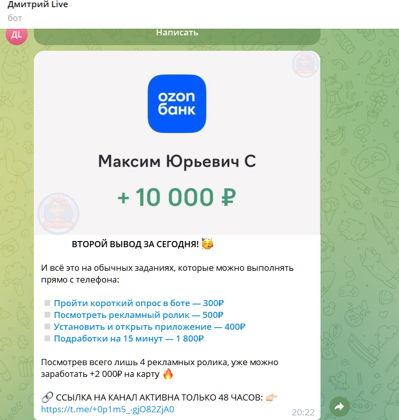 В постах трейдера подчеркивается, что успешный вывод средств и большой доход гарантирован. Но важно успеть подписаться на очередной фейковый ТГ бот или канал по поиску работы.