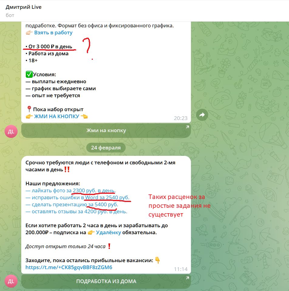Фейковые предложения удаленной работы в ТГ боте Dmitriy Live