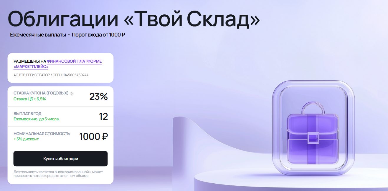 Также Дмитрий предлагает инвесторам покупку облигаций фирмы «Твой Склад». Цена – от 1 000 рублей. Процентная ставка купона – 23%. Выплата дохода производится раз в месяц. Купить облигацию можно на сайте tvoysklad com.
