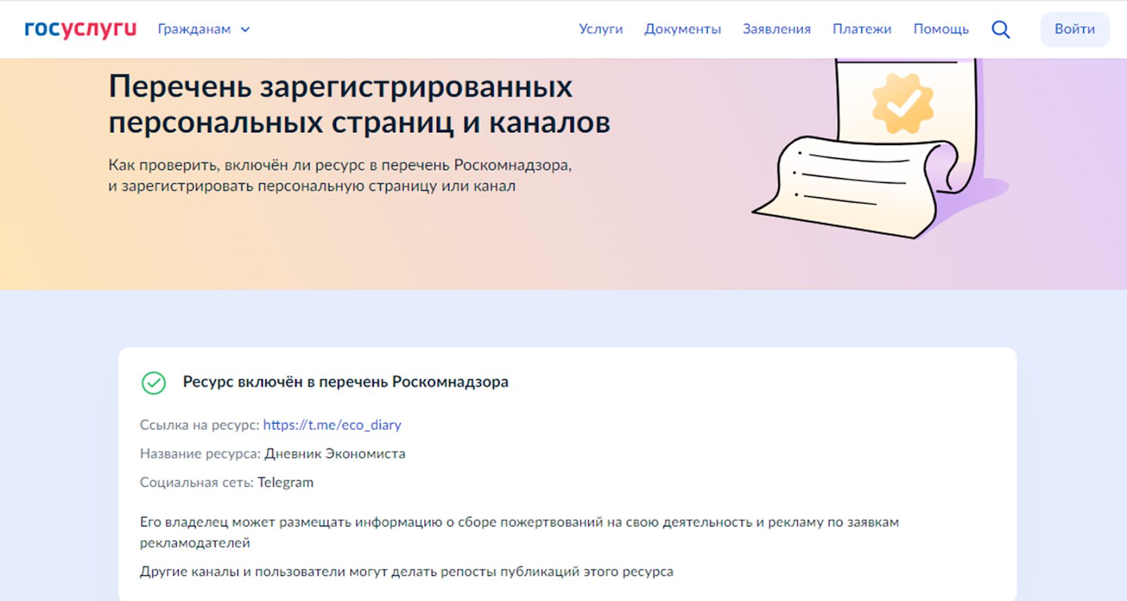 Зато дана ссылка, которая подтверждает официальную регистрацию в реестре Роскомнадзора. Это означает, что контент, опубликованный на канале можно репостить и он проверен. Также нахождение в реестре дает право разработчикам брать деньги за свои услуги и публикацию рекламы на канале.