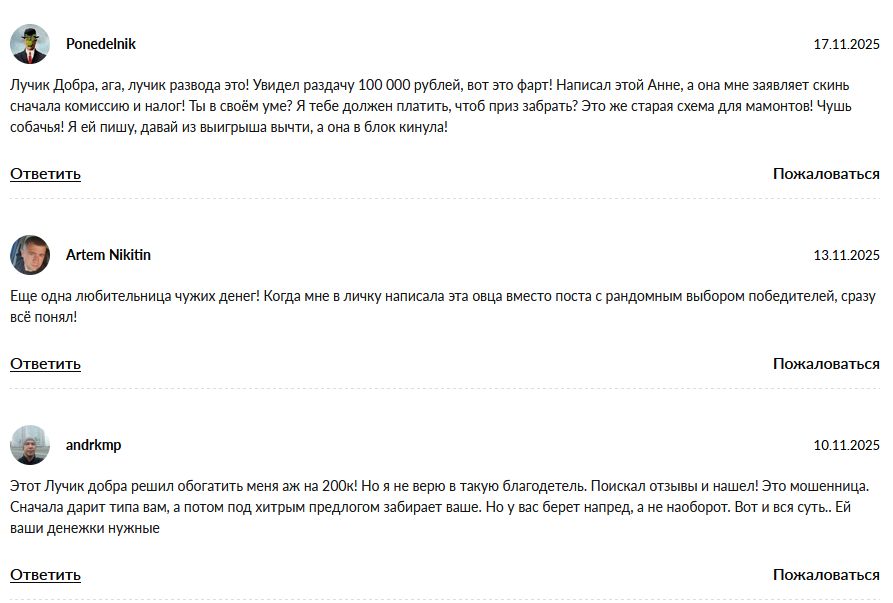 В отзывах пользователи рассказывают о том, как проходит взаимодействие с Dobrotaa Vnytri. После подтверждения своего участия в розыгрыше человек получает уведомление о выигрыше. Далее Анна сообщает, что платеж заблокирован из-за перегрузки банковской системы (тот самый антифрод) и нужно заплатить налог, чтобы его разблокировать.