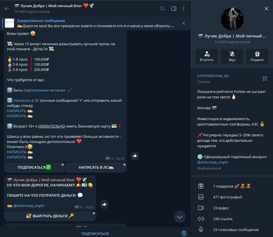 «Лучик Добра | Мой личный блог» – это телеграм-канал состоятельной девушки по имени Анна, которая проводит бесплатную раздачу денег подписчикам. Из статьи вы узнаете, как устроена система розыгрышей Dobrotaa Vnytri и что пишут о канале люди в отзывах.