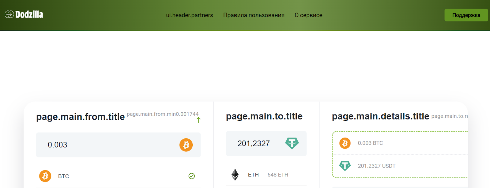 Сервис для обмена криптовалют Dodzilla предлагает пользователям на главной странице выбрать токены и узнать курс по интересующим направлениям. Сервис дает мало информации о себе, описывая только правила обмена криптовалют. Здесь для обмена доступны такие токены как: