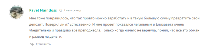 Для участия нужно написать Елизавете в личку. Она просит перевести депозит на реквизиты. Обещает выплату завтра. Договоров нет. Документов не оформляют. Гарантий никаких.