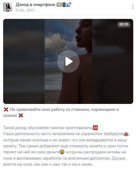 Елизавета объясняет прибыль стратегией пампа крипты. Команда «Доход в Смартфоне» искусственно поднимает цену выбранной монеты. Продает на пике. Делит прибыль между вкладчиками. Основные жертвы – украинские трейдеры. Автор даже публикует посты с оскорблениями в адрес украинцев.