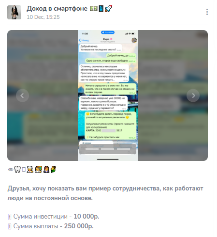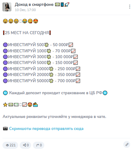 Автор якобы создала закрытый чат для постоянных инвесторов. Туда попадают те, кто вложил от 5 тысяч рублей. Обещает особые условия и приоритет в работе. Это мотивирует вкладывать больше денег.