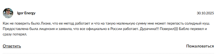 Негативные отзывы о «Доход в Смартфоне» касаются потери денег и блокировки. Люди жалуются на исчезновение Елизаветы после перевода. Клиенты пишут о дополнительных требованиях уже после первого взноса. Сначала просят основной депозит. Потом требуют еще деньги якобы для обхода банковской системы. После второго платежа связь обрывается. Доступ блокируют.